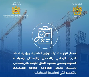 قرار مشترك لوزير الداخلية ووزيرة إعداد التراب الوطني والتعمير والإسكان وسياسة المدينة بتحديد الآجال اللازمة لكل متدخل بالنسبة لبعض القرارات الإدارية المتعلقة بالتعمير التي تسلمها الجماعات