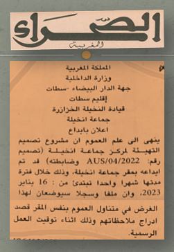ينهى إلى علم العموم أن مشروع تصميم تهيئة مركز جماعة النخيلة رقم 04/2022 وضابطته، قد تم إيداعه بمقر الجماعة وذلك خلال فترة مدتها شهرا واحدا تبتدئ ... Read More
